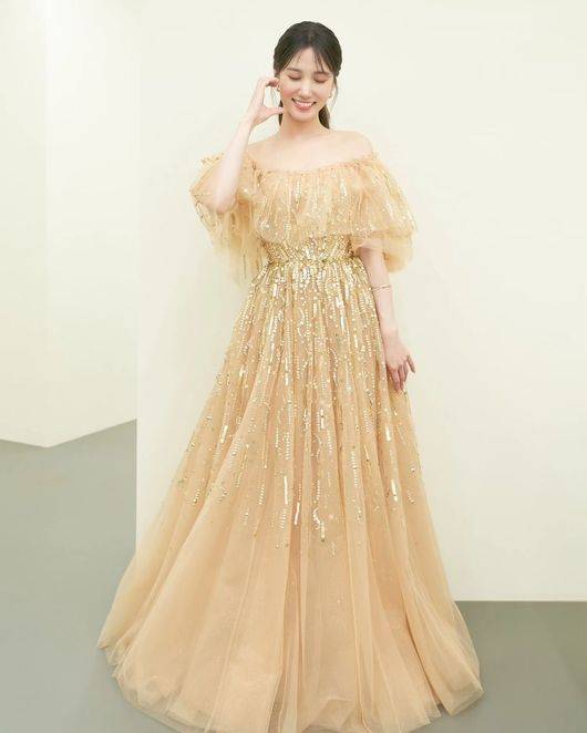사진 속에서 박은빈은 오프숄더 디자인의 금빛 시폰 롱드레스를 입고 단아하게 머리를 묶고 있는 모습이다. 금빛 드레스를 입어 박은빈의 하얀 피부가 더욱 돋보인다.