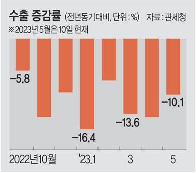 5월 들어서도 한국경제의 버팀목인 수출이 전혀 반등하지 못하고 있다. 5월 1∼10일 수출이 전년 동기 대비 10.1% 감소하면서 14개월 넘게 무역수지 적자 흐름이 이어지고 있는 것으로, 올해 들어 누적된 무역적자 규모도 약 300억 달러(약 39조5700억 원)에 달한다. 반도체와 대중 수출에 크게 의존하고 있는 현행 수출 구조를 바꾸지 못하면 무역적자 규모가 눈덩이처럼 불어날 수 있다는 우려가 커지고 있다.