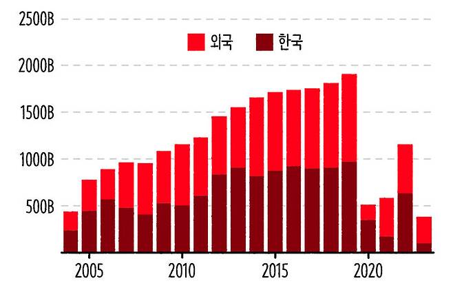 또 하나의 변해버린 환경은 OTT의 성장을 이야기할 수 있을 겁니다. 위의 그래프는 영화관입장권통합전산망(KOBIS) 자료인데 2004년부터 2023년까지 우리나라 극장 매출을 나타낸 거예요. 2023년은 현재 진행형이고요. 2004년부터 2019년까지의 흐름을 보면 우리나라 극장 수익은 꾸준한 성장이 이어졌어요. 거기에 국내 영화가 외화와 비교해 봤을 때 매출 규모가 꿀리지 않죠. 절반가량은 한국 영화 매출에서 나왔습니다.