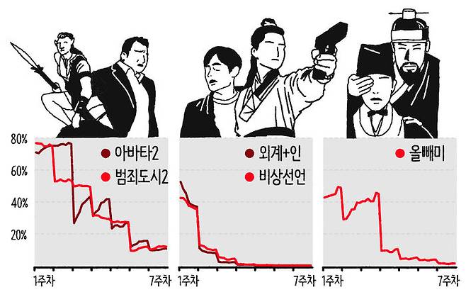 우선 '범죄도시 2'와 '아바타: 물의 길'의 사례를 볼까요? 오락성과 액션으로 중무장한 '범죄도시 2'와 엄청난 컴퓨터 그래픽으로 압도적인 영상미를 구현한 '아바타: 물의 길'은 모두 관객의 눈을 사로잡을 수 있는 스펙터클한 영화라고 할 수 있을 겁니다. 두 작품은 거리두기 해제 이후 2022년에 1,000만 관객을 돌파했어요. 그래프를 보면 알겠지만 개봉 3주 차, 4주 차까지 좌석점유율 40%대를 유지하면서 관객 동원을 꾸준하게 이어오면서 흥행 대박을 일궈냈습니다.