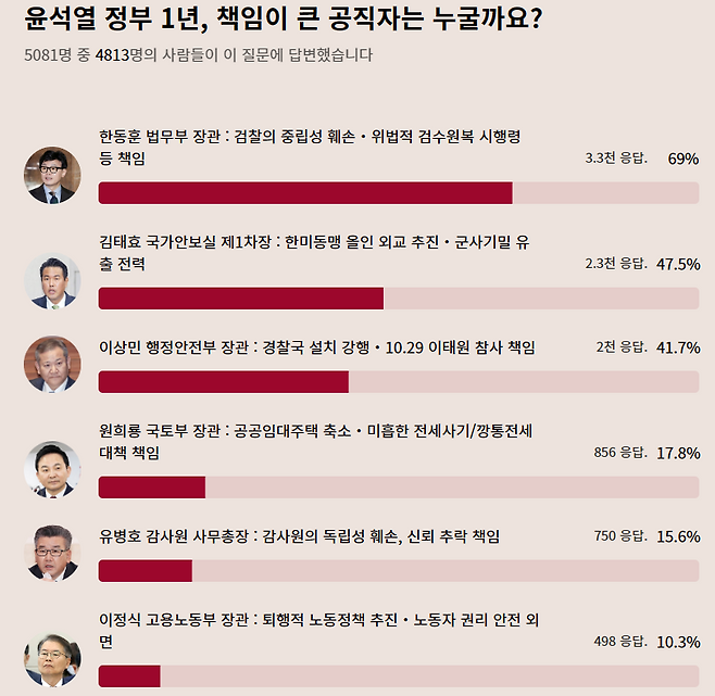그러면, 참여연대의 온라인 설문조사 결과를 볼까요? '윤석열 정부 1년 퇴행과 폭주에 책임을 지고 가장 먼저 교체되어야 할 공직자는 누구일까요?'라는 질문이었고요, 설문 대상 5081명 가운데 4813명이 응답했다고 합니다. 또 미리 대상자를 올리고 3명까지 복수응답하는 방식이었다고 합니다.