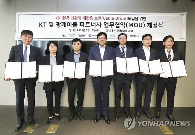 (서울=연합뉴스) KT가 지난 11일 서울 종로구 KT East사옥에서 LS전선 등 5개 광케이블사, 보빈뱅크와 '친환경 케이블 보빈 도입을 위한 업무협약(MOU)을 체결했다고 12일 밝혔다. 사진은 협약 체결 후 기념 촬영하는 박종구 가온전선 부문장(왼쪽부터), 이진철 대한광통신 부문장, 김종협 머큐리 사장, 조훈 KT SCM전략실장, 이동욱 LS전선 통신사업부장, 황병선 이에스테크 대표이사, 김용석 보빈뱅크 대표이사. 2023.5.12 [KT 제공. 재판매 및 DB 금지]