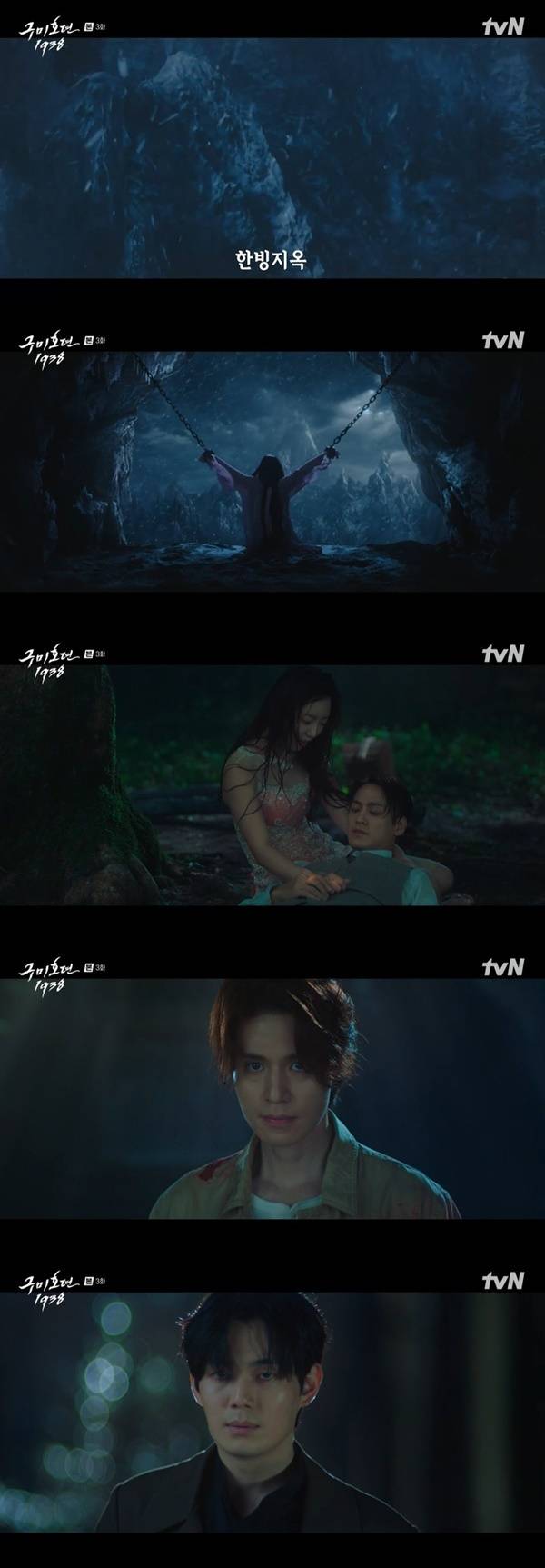 천무영은 이연과 다음을 기약하며 “넌 영원히 과거에 갇혀서 네가 아끼는 모든 게 죽어가는 걸 보게 될 거다”고 저주했고 이연은 “내가 떠나도 랑이 옆에 누군가 있어주면 좋겠다. 적어도 쟤들이 살아갈 시대에 홍백탈 같은 것 절대 살려두지 않을 거다”고 복수 선언했다. (사진=tvN ‘구미호뎐1938’ 캡처)