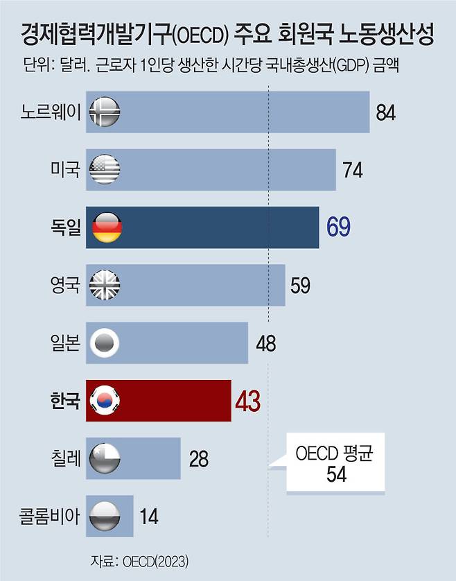 독일 근로자들은 ‘짧게, 효율적으로, 유연하게’ 일하고 있었다. 2021년 경제협력개발기구(OECD) 회원국 근로시간 자료를 보면 독일의 연평균 근로시간은 1349시간, 한국은 1910시간이었다. 근로자 1인당 국내총생산(GDP)을 근로시간으로 나눈 노동생산성은 올해 독일이 시간당 69달러(약 9만2000원), 한국이 43달러(약 5만7000원)였다. 독일이 한국보다 집중적, 효율적으로 일하고 있다는 뜻이다. OECD 회원국 중 가장 짧게 일하는 독일이 유럽 최대 제조 강국일 수 있는 비결이었다.