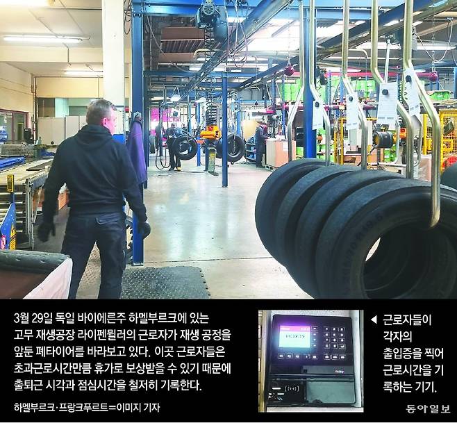 3월 29일 독일 중부 바이에른주 하멜부르크에 있는 라이펜뮐러 고무 재생공장. 생산직 근로자들이 기계 앞에서 작업에 여념이 없었다. 오전 근무조 25명은 오전 6시 45분부터 오후 3시 반까지, 오후 근무조 10명은 오후 3시 반부터 11시 45분까지 일한다. 이 회사 우베 뮐러 대표는 “일이 몰릴 때는 하루 최대 10시간까지 일할 수 있다. 더 오래 일하려면 지역 노동관청의 허가를 받으면 된다”고 말했다.