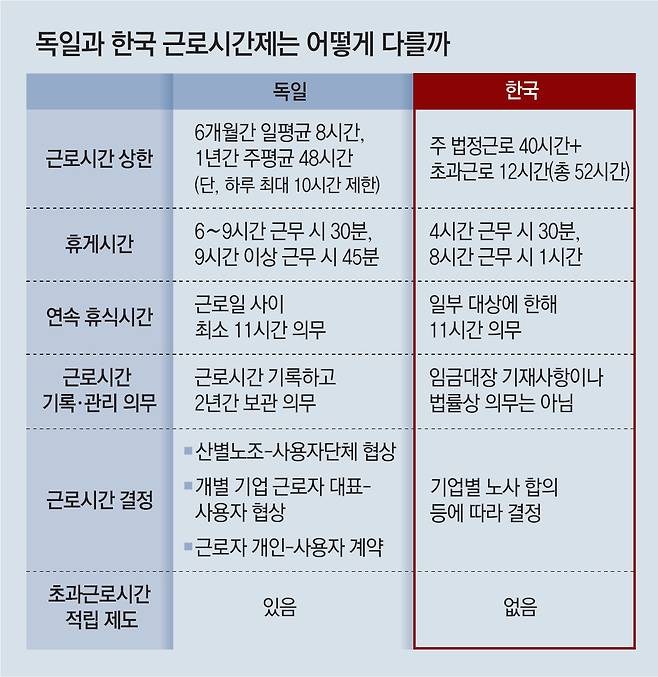 독일의 법정 근로시간은 ‘6개월 내 하루 평균 8시간, 1년 내 일주일 평균 48시간(주 6일 기준)’이다. 초과근로 때는 하루에 최장 10시간, 주 최대 60시간 일할 수 있다. 많은 사업장은 한 주 초과근로를 하면 다음 주 덜 일하는 식으로 ‘8시간, 48시간 평균’을 맞춘다.