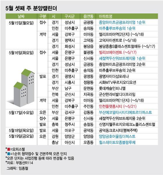 14일 부동산R114에 따르면 5월 셋째 주에는 전국 4개 단지에서 총 977가구(일반분양 736가구)가 분양을 시작한다. 서울 은평구 신사동 '새절역 두산위브트레지움', 경기 성남시 중원구 금광동 '중앙하이츠 금광 프리미엄', 인천 미추홀구 숭의동 '미추홀 루브르 숭의' 등에서 청약을 진행한다.