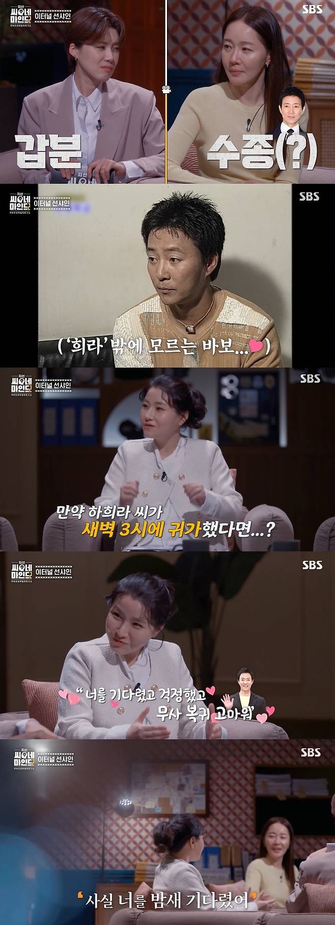 박지선은 "새벽 3시에 하희라 씨가 들어왔다면 최수종 씨는 "너를 기다렸고 걱정했고 건강히 들어와줘서 고맙다"고 하지 않을까. 사실 내가 기다렸다는, 솔직한 표현이 필요했다"고 전했다.