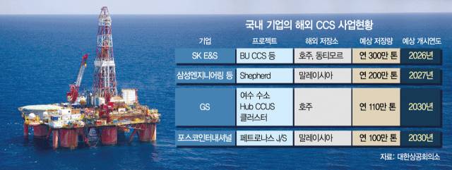 포스코인터내셔널(047050)은 CCS 사업화를 위해 지난해부터 호주에서 고갈된 해상 가스전을 활용해 CCS 사업의 경제성을 분석하고 있다. 지난해 인수한 호주 세넥스에너지와도 CCS 사업화를 위한 기술평가와 경제성 분석 작업을 진행하고 있다. 말레이시아에서는 국영 석유 기업 페트로나스와 함께 국내에서 포집한 이산화탄소를 염대수층과 해상 고갈 가스전에 저장하는 사업 모델을 개발하고 있다. 삼성엔지니어링도 국내 산업단지에서 발생한 이산화탄소를 포집해 말레이시아로 이송·저장하는 사업인 셰퍼드 CCS 프로젝트를 국내외 6개사와 공동으로 진행하고 있다.