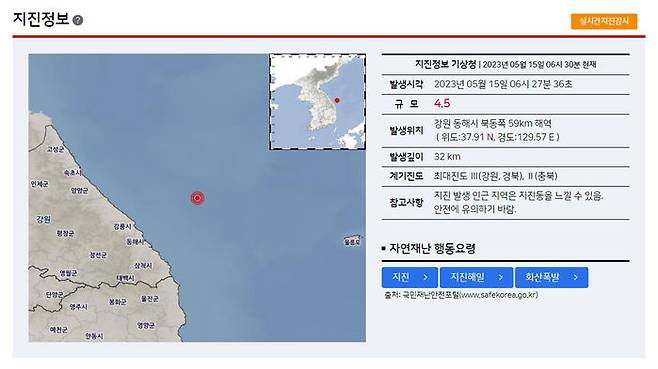 지난달부터 지진이 연잇는 강원 동해시 북동쪽 해역에서 오늘(15일) 오전 6시 27분 규모 4.5 지진이 일어 월요일 아침부터 많은 국민이 놀란 가슴을 쓸어내려야 했습니다.
