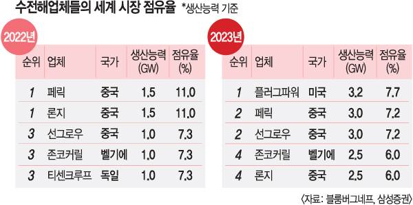 15일 블룸버그네프에 따르면 세계 수전해 상위 5개 기업(생산능력 기준) 가운데 3곳이 중국 기업이다. 페릭(PERIC), 론지(LONGi), 선그로우(Sungrow)는 원가경쟁력을 무기로 수전해 시장에서 우위를 차지했다. 물을 전기분해해 수소를 만드는 게 수전해다. 신재생 에너지로 생산한 전기를 수전해에 활용해 만든 수소를 그린 수소라고 부른다. 그린 수소가 미래 경제 생태계에서 핵심 역할을 할 에너지원으로 떠올랐다. 수소는 재생에너지의 간헐성을 보완할 수 있어 탈탄소 경제의 ‘마지막 퍼즐’로 불리기도 한다. 그린 수소는 생산 과정에서 이산화탄소를 배출하지 않는다.