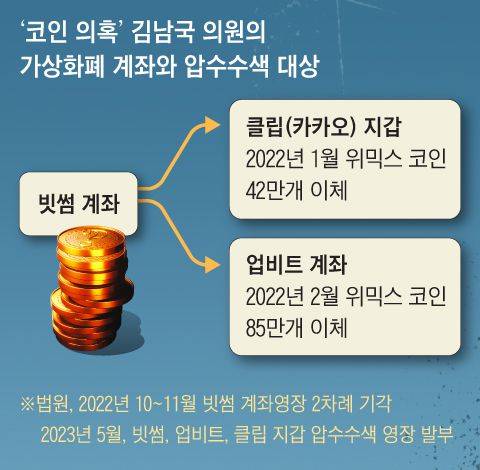 앞서 작년 10~11월 검찰은 김 의원이 보유하고 있던 빗썸의 가상 화폐 전자 지갑에 대해 두 차례 압수 수색 영장을 청구했다가 법원에서 모두 기각당했다. 최근 김 의원의 ‘위믹스 코인 60억 보유’ 논란이 불거진 이후, 검찰은 업비트와 클립(카카오 전자 지갑)으로 범위를 넓힌 세 번째 압수 수색 영장을 청구했고 법원은 이를 발부한 것으로 전해졌다. 검찰은 이날 확보한 자료를 분석해 김남국 의원을 둘러싼 의혹에 대해 본격 규명한다는 방침이다.
