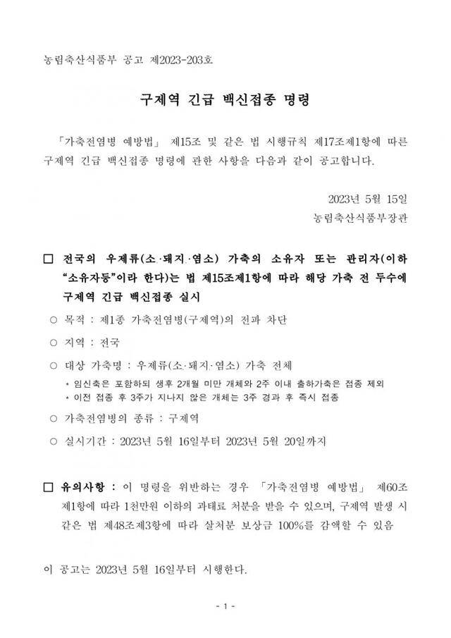 이는 '가축전염병 예방법' 제15조제1항에 따른 조치로, 전국 소·돼지·염소 등 우제류 가축 소유자 및 관리자를 대상으로 한다. 해당 가축 소유자는 소유 가축 전체를 대상으로 긴급 백신을 접종해야 한다.