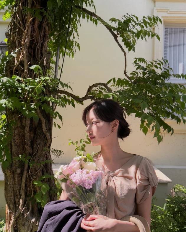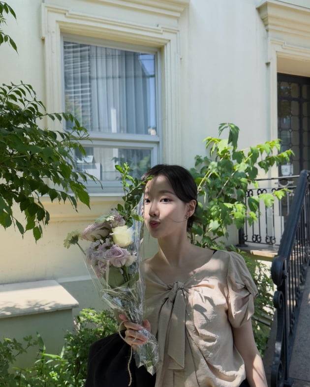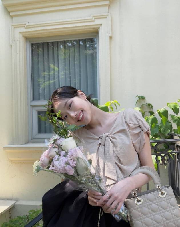 이나은은 반소매 블라우스와 명품 D사 가방을 들고 포즈를 취하고 있다. 그의 오른손에는 꽃다발이 자리했다.