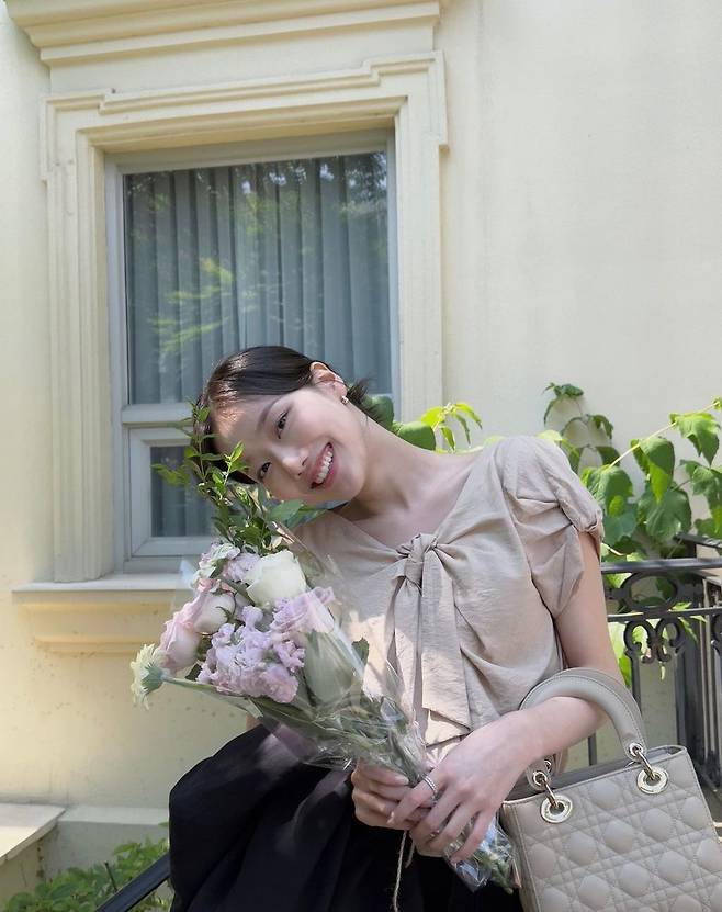 공개된 사진 속 이나은은 꽃다발을 손에 쥐고 환하게 웃고 있다.