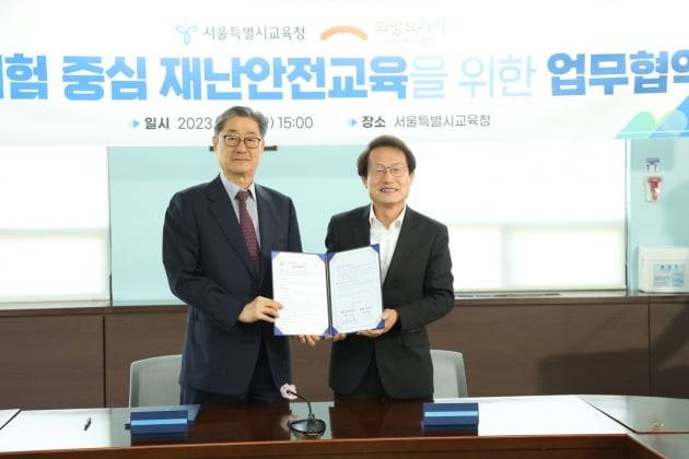 서울특별시교육청(교육감 조희연·사진 오른쪽)과 희망브리지 전국재해구호협회(회장 송필호)가 학생들의 재난 안전 교육 등을 위해 16일 업무협약을 체결했다.
