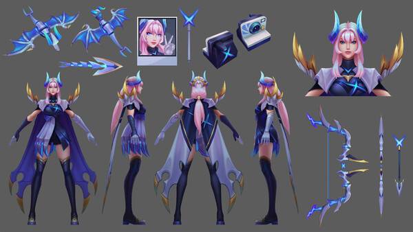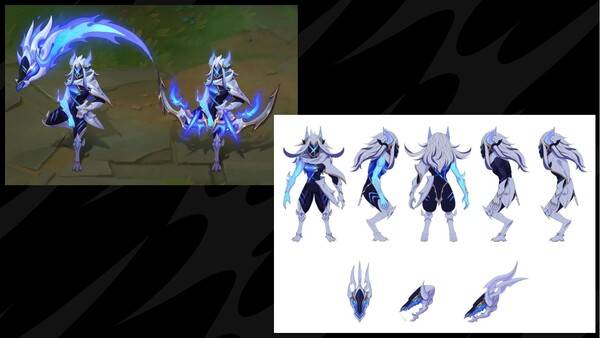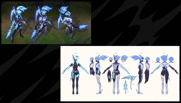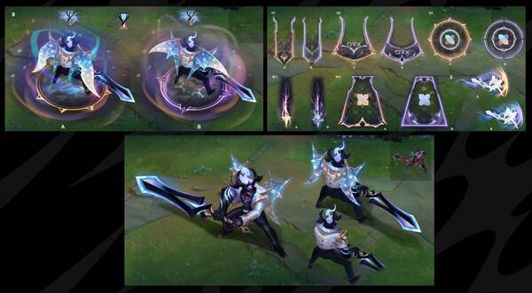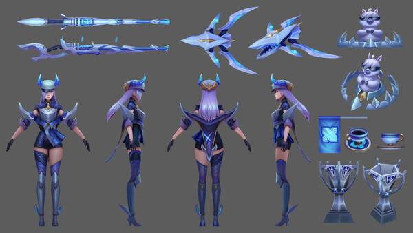 DRX 우승 스킨에는 활력적이면서 현대적인 느낌을 살리고 싶었다. DRX 팀도 좋아할 만한 색상을 찾기 위해 정말 많은 작업을 거쳤다. 단순 스킨 색상만 신경 쓰면 안 된다. 소환사의 협곡 백그라운드 색상과 잘 어울려야 한다. 최종 3D 작업을 진행할 때 백그라운드와 어떻게 대비되는지 확인하며 진행했다. 궁극적으로 깨끗하면서 청량한 블루를 원했고 그게 잘 표현된 것 같다.