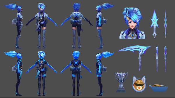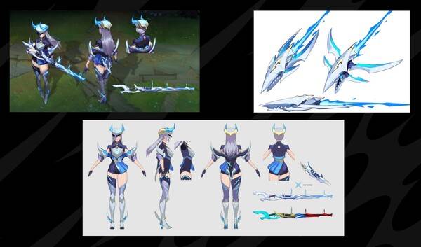 DRX 우승 스킨에는 활력적이면서 현대적인 느낌을 살리고 싶었다. DRX 팀도 좋아할 만한 색상을 찾기 위해 정말 많은 작업을 거쳤다. 단순 스킨 색상만 신경 쓰면 안 된다. 소환사의 협곡 백그라운드 색상과 잘 어울려야 한다. 최종 3D 작업을 진행할 때 백그라운드와 어떻게 대비되는지 확인하며 진행했다. 궁극적으로 깨끗하면서 청량한 블루를 원했고 그게 잘 표현된 것 같다.