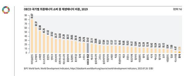 | ▲ 한국의 재생에너지 비중은 OECD 국가 중 꼴찌입니다. 상위권 국가와는 비교 자체가 어렵고 전체 평균에 비해도 15%가 채 안됩니다. |