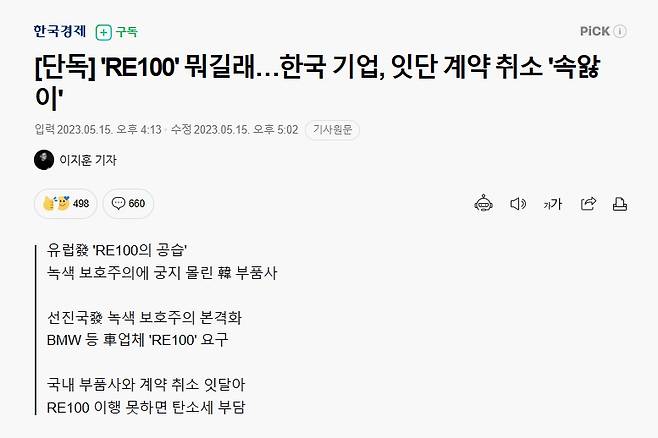 "유럽 완성차 업체들이 국내 기업들에 재생에너지만 사용해 제품을 생산하는 'RE100'을 요구하고 나서면서, 이들 기업이 한국 부품사와 맺은 계약이 잇따라 취소되고 있"는데, "당장 국내 부품사들은 RE100을 실천할 방도가 없어서 전전긍긍 속앓이를 하고 있다"는 내용입니다. 기업들 입장에선 "속수무책"이란 표현도 있습니다.