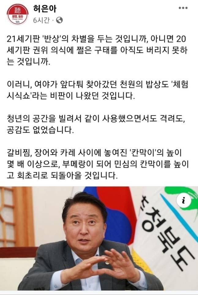 김영환 충북지사(바로 위 사진)와 국회의원 등이 대학생 기숙사 식당에서 학생들 한끼보다 10배 이상 비싼 특식을 제공받은 사실이 알려지면서 여론의 뭇매를 맞고 있다.