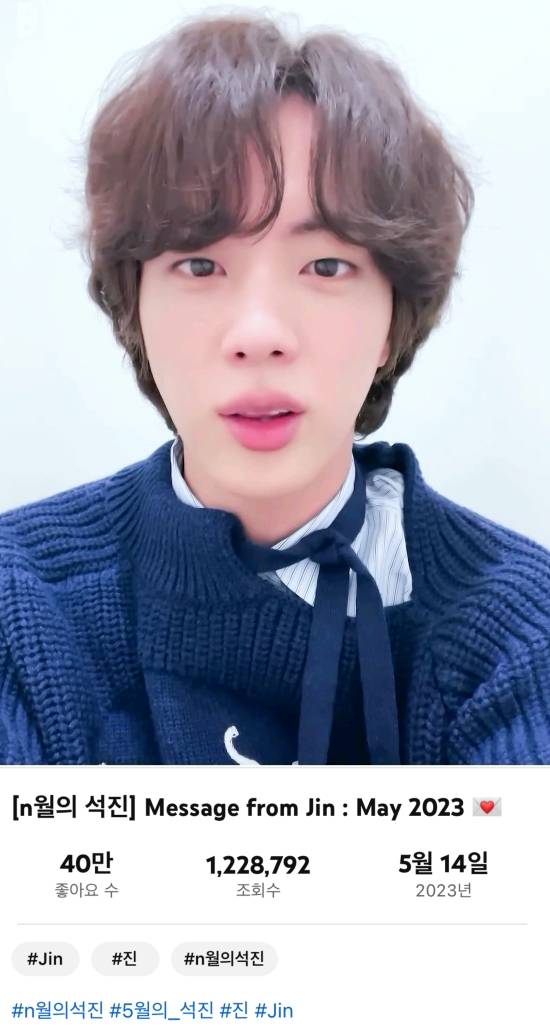 방탄소년단은 지난 14일 공식 유튜브 채널 'BANGTANTV'를 통해 "[n월의 석진]Message from Jin : May 2023"라는 제목의 영상을 게재했다.