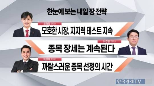 이날 방송에는 한국경제TV 주식 파트너인 ▲최영동 ▲이주형 ▲이경락이 출연해 각각의 전망과 종목 코멘트를 제시했다.