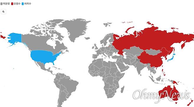 | ▲ 일본 정부가 방류하려는 후쿠시마 제1원전 오염수를 정부 차원에서 '처리수'라고 부르는 국가(파란색)와 '오염수'라고 부르는 국가(붉은색). 각국 정부 공식 자료 확인(자료 정리 : 오마이팩트 김시연·강석찬) |