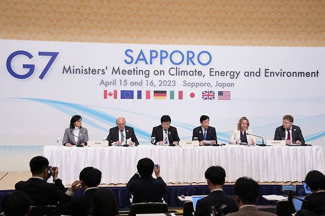 | ▲ 지난 16일 일본 삿포로에서 열린 주요 7개국(G7) 기후·에너지·환경 장관회의 공동 기자 회견이 열리고 있다. 왼쪽부터 바니아 가바 이탈리아 생태전환부 국무차관, 길베르토 피체토 프라틴 이탈리아 환경장관, 니시무라 아키히로 일본 환경장관, 니시무라 야스토시 일본 경제장관, 스테피 렘케 독일 환경장관, 패트릭 그라이첸 독일 경제기후장관. |