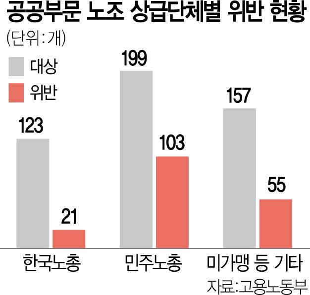 17일 고용노동부가 올해 3월부터 실시한 공공 부문 단체협약 실태 조사 결과에 따르면 479개 기관 중 179곳(37.4%)은 단체협약에서 관계 법령을 위반했다. 법 위반은 아니지만 특혜, 인사 침해 등 사회통념상 불합리하다고 볼 수 있는 단협을 체결한 기관도 135곳(28.2%)이다. 전체 2곳 중 1곳꼴로 공공 부문 단협이 법과 상식 밖에 있다는 얘기다. 불법이나 무효 단협이 있는 기관의 상급 노조를 보면 민주노총이 103곳, 한국노총이 21곳이다.