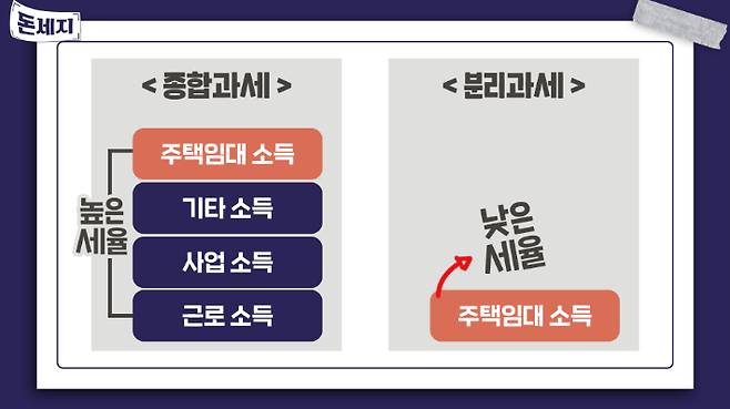 이거를 저희는 '분리과세'라고 말을 합니다. 종합소득이랑 다른 소득과 합해서 세금 신고를 하는 게 아니라, 그거는 그거대로 하고 이 주택 임대 소득에 대해서는 분리해서 그것만 더 하겠다 이런 개념으로 보시면 될 것 같습니다.