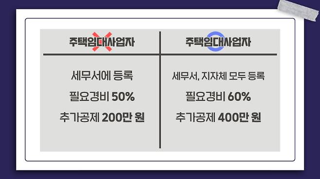 아까 전에 주택 임대사업자로 등록을 안 하신 분들 같은 경우에는 세무서에만 사업자 등록을 하신 분들이거든요. 이런 분들은 아까 50%까지만 필요 경비를 인정해 준다고 했는데, 이 분(주택임대사업자)들은 (필요경비를 임대소득의) 60%를 빼주는 거예요. 그러면 내가 번 월세 소득에서