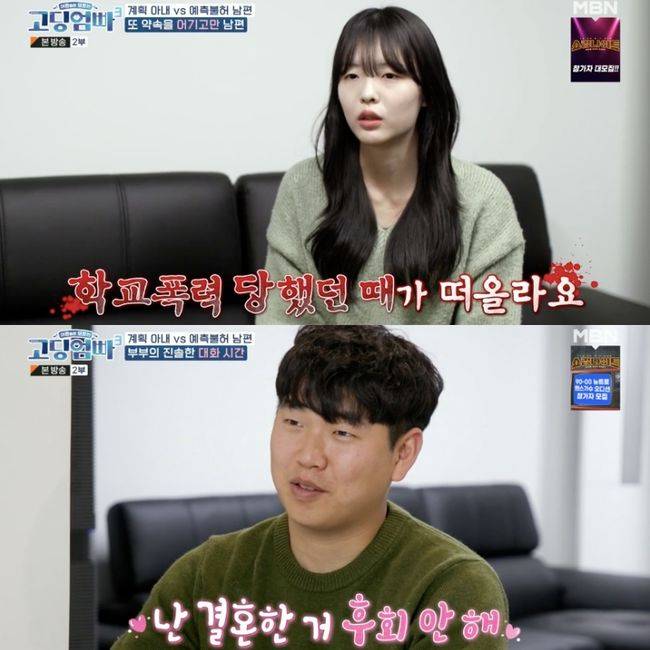 하지만 새롭게 전학간 학교에서 김민정은 온전하게 생활하지 못했다. 바로 학교폭력 트라우마 때문. 거기에 공황장애까지 겹쳤다고. 2년이라는 시간이 흘러 18살이 되던 김민정은 소문이 잠잠해지자 다시 고향으로 돌아와 알바를 하며 생활하고 있었다. 그러다 SNS에서 구직공고를 보게 된 김민정은 지금의 남편을 만나 연인으로 발전하게 됐다.