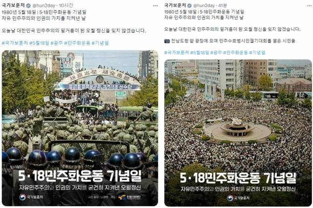 보훈처는 18일 트위터, 페이스북 등에 광주 민주화운동 당시 광주 시민과 계엄군이 대치하고 있는 상황을 찍은 사진을 배경으로 '5.18 민주화운동 기념일, 자유민주주의와 인권의 가치를 굳건히 지켜낸 오월정신'이라는 문구를 넣은 게시물을 올렸다.