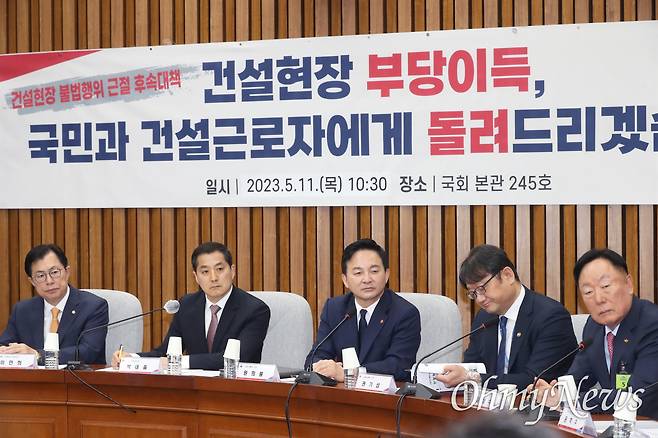 | ▲ 박대출 국민의힘 정책위의장과 원희룡 국토교통부 장관 등이 11일 서울 여의도 국회에서 열린 건설현장 불법?부당행위 근절대책 후속조치 관련 민-당-정 협의회에서 참석자의 발언을 듣고 있다. |