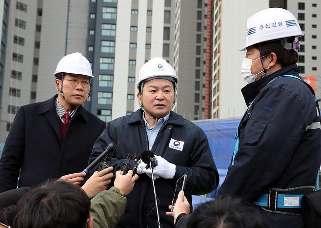 | ▲ 원희룡 국토교통부 장관이 5일 오전 부산 동구 범일동 한 아파트 공사현장을 찾아 공사현장관계자로 부터 건설노조의 화물연대 동조파업에 따른 운영 차질 상황을 청취하고 있다. 2022.12.5 |