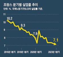 노동개혁의 긴 여정을 거치며 최근 프랑스의 고용지표는 눈에 띄게 개선됐다. 프랑스 통계청(INSEE)은 17일 올해 1분기(1∼3월) 실업률이 7.1%로 1982년 2분기(7.1%) 이후 41년 만에 최저치로 집계됐다고 발표했다. 생산가능인구(15∼64세)의 경제활동률은 73.9%로 관련 통계 집계 이후 최고치였다.