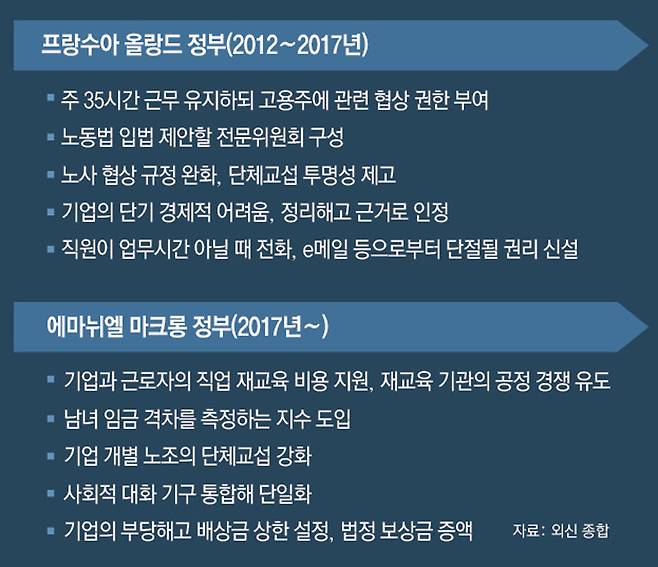 노동개혁에 제대로 속도를 낸 건 2017년 처음 집권한 중도 성향 앙마르슈(전진)의 마크롱 대통령이었다. 개혁을 정치적 정체성으로 삼은 그는 노동개혁에 속도를 내 집권 4개월 만인 9월 노동법 개정안에 서명했다.