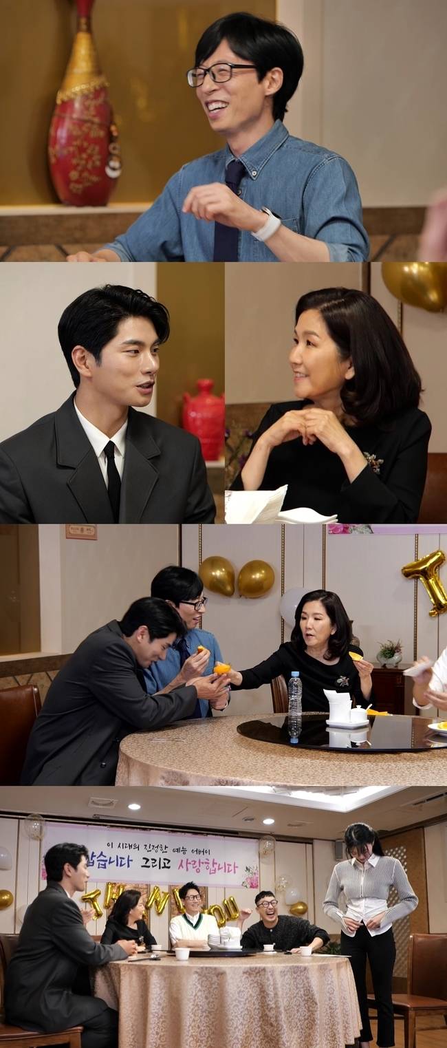 공개된 사진 속에는 이성미의 이이경 편애에 심통이 난 유재석의 모습이 포착돼 웃음을 자아낸다. 이성미는 꿀이 뚝뚝 떨어지는 눈빛으로 이이경을 바라보고 있다. 또 이이경에게 오렌지를 챙겨주는 예능 어머니의 자상함도 포착됐다. 둘 사이에 낀 유재석은 서운한 듯 이성미를 바라보고 있다.