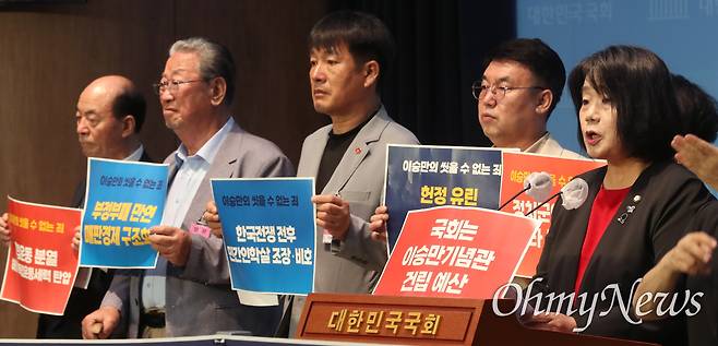 | ▲ 윤미향 "이승만기념관 건립 중단하라" 윤미향 무소속 의원이 19일 서울 여의도 국회 소통관에서 박민식 국가보훈부 장관 후보자 이승만기념관 건립 반대 기자회견을 하고 있다. |