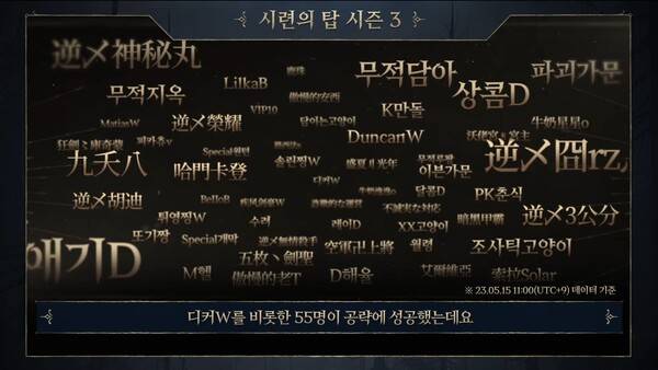 한편, 리니지W는 지난 10일 시련의 탑 시즌3를 선보였다. 24일까지 개최되는 시련의 탑 시즌3는 25층까지 확장됐다. 당연히 25층 난도는 최고 수준을 자랑한다. 25층은 14일 최초로 개방됐고 '디커W'를 비롯한 55명의 유저가 성공했다.