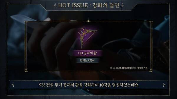 엔씨는 TJ's 프레스티지 쿠폰 지급 기념 '강화의 달인' 코너를 통해 인상적인 강화 성공 사례를 소개했다. 가장 먼저 소개된 사례는 아툰 월드 '담이는고양이'의 '+10 공허의 활'이다. 그는 지난 3월 9강 전설 등급 무기 공허의 활을 강화해 10강을 달성했다. 10강 강화에 성공할 확률은 1%다. 그가 얼마나 강심장을 가지고 있는지 알 수 있는 대목이다.