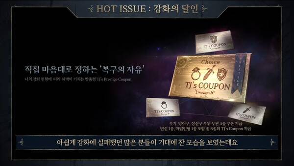 TJ's 프레스티지 쿠폰은 원하는 부위 아이템을 3회까지 복구할 수 있는 기회가 주어진다. 덕분에 아쉽게 강화에 실패했던 유저들이 TJ's 프레스티지 쿠폰이 지급되기를 애타게 기다리고 있다.