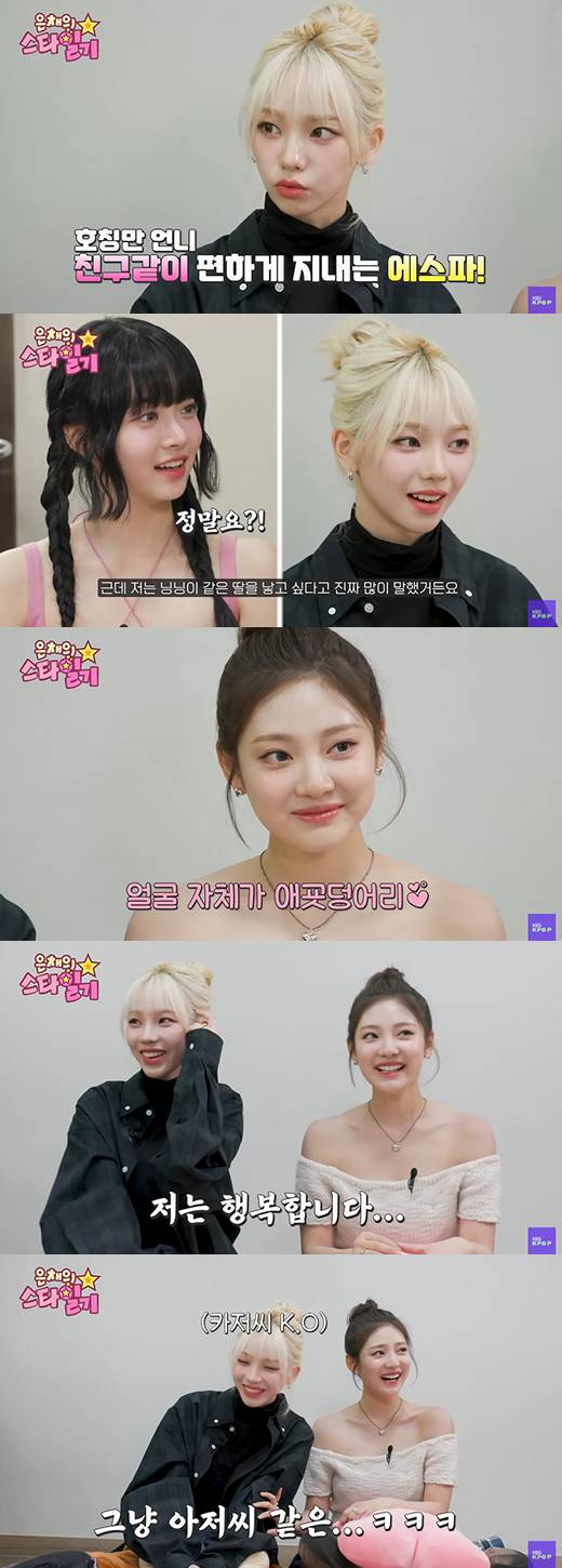 그러자 은채가 카리나에게 "귀찮냐"며 질문했고, 에스파의 맏언니인 카리나는 "아니다. 저는 행복하다. 좋다"고 답하며 미소 지었다.