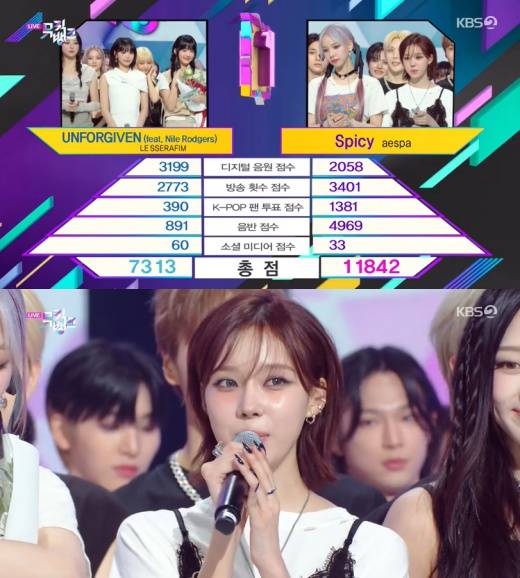 19일 오후 방송된 KBS 2TV '뮤직뱅크'에서는 르세라핌의 '언포기븐(Unforgiven)'과 에스파의 '스파이시'가 5월 셋째 주 1위 후보로 올랐다.