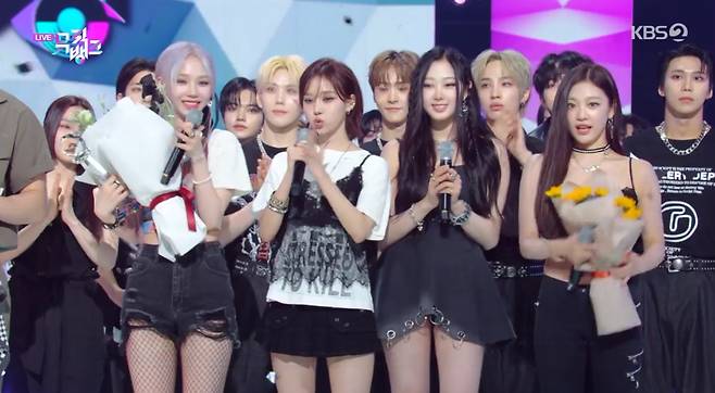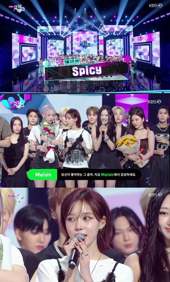 19일 방송된 KBS 2TV '뮤직뱅크'(이하 '뮤뱅') 1164회에서는 그룹 르세라핌의 '언포기븐(UNFORGIVEN)'과 에스파의 '스파이시(Spicy)'가 5월 셋째 주 1위 후보에 오른 가운데, 에스파가 1위를 거머쥐었다.