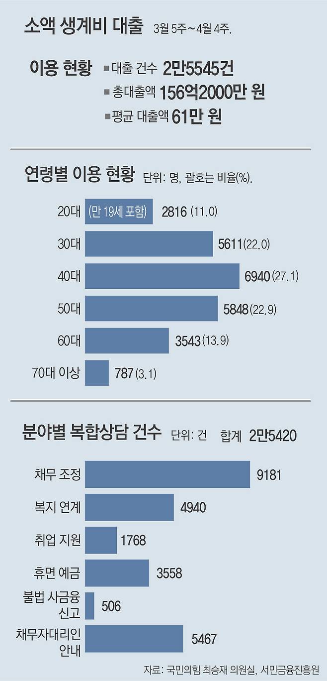 3월 27일부터 전국 46곳의 서민금융통합지원센터에 마련된 소액 생계비 대출 상담창구에는 A 씨처럼 절박한 형편을 호소하는 신청자들의 발길이 이어지고 있다. 출시 이후 5주 동안 실행된 대출은 2만5000여 건. 이용자 절반이 40, 50대지만 20대 젊은 대출자의 비중도 10%를 넘는 것으로 집계됐다.