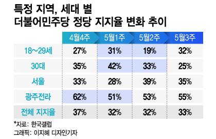 돈 봉투 의혹은 호남 민주당 지지자들에게 영향을 미친 것으로 분석됐다. 4월4주 차 조사에서 62%였던 호남 지지율은 5월1주차 조사 결과 51%로 11%p나 내려앉았다. 이후에도 △53% △55% 등 50%대를 이어오고 있다.