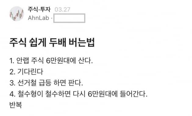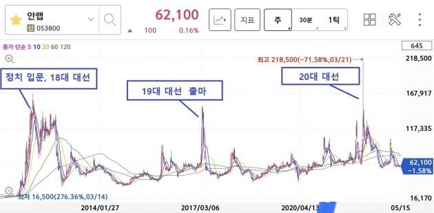 안랩으로 재미를 본 투자자들은 진입 시점을 저울질하고 있습니다. 내년 4월 열리는 22대 국회의원 선거를 앞두고 안 의원의 역할이 부각될 것이란 기대가 커지고 있기 때문입니다.