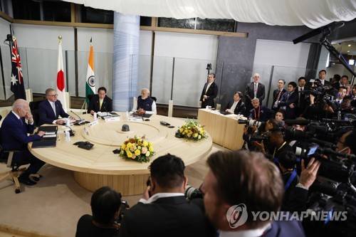 U.S. President Joe Biden, from left, Australia's Prime Minister Anthony Albanese, Japan's Prime Minister Fumio Kishida and India's Prime Minister Narendra Modi hold a Quad meeting on the sidelines of the G7 summit, at the Grand Prince Hotel in Hiroshima, western Japan, Saturday, May 20, 2023. (Jonathan Ernst/Pool Photo via AP) POOL PHOTO